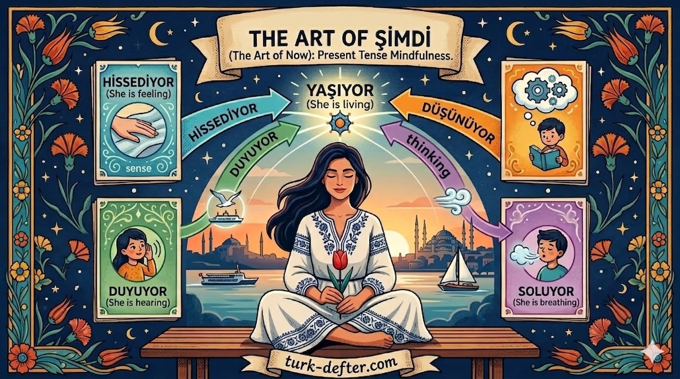 A practical guide to the Turkish present tense (-iyor), covering vowel harmony, stem changes, and examples for actions, habits, and planned future events.